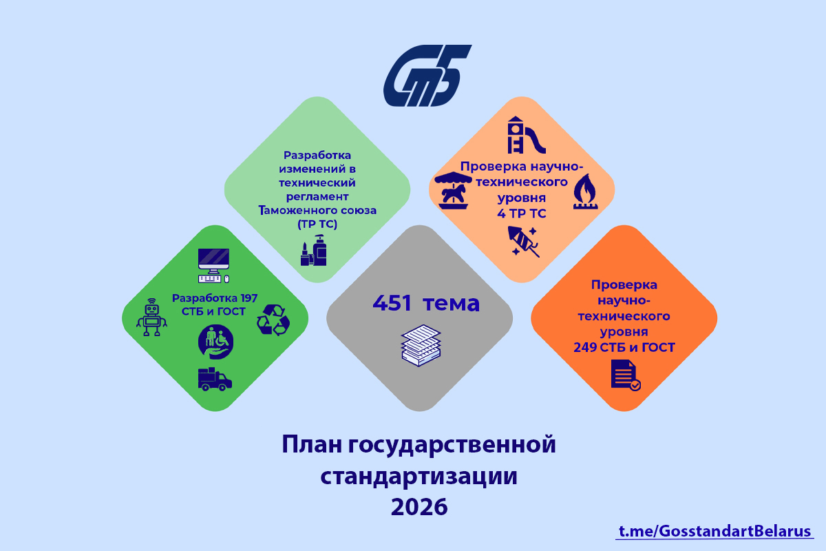 Выполнение плана государственной стандартизации – 2026 направлено на реализацию Стратегии развития стандартизации Республики Беларусь на период до 2030 г. и решение задач по повышению технического уровня, безопасности и качества выпускаемой продукции, импортозамещению, росту экспортных возможностей отечественных изготовителей, устранению технических барьеров в торговле, внедрению инноваций, рациональному использованию ресурсов.